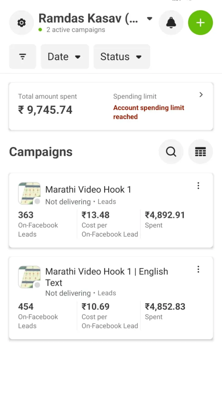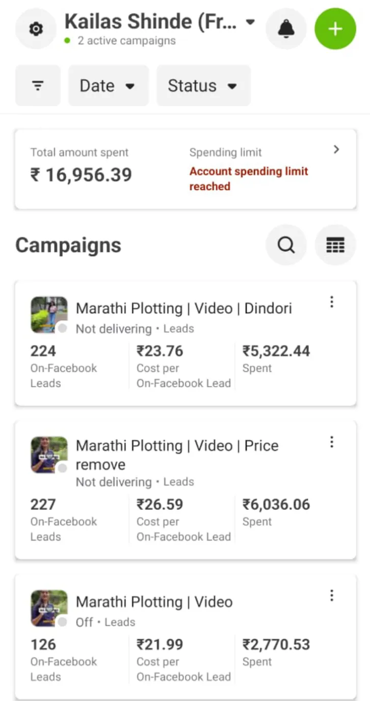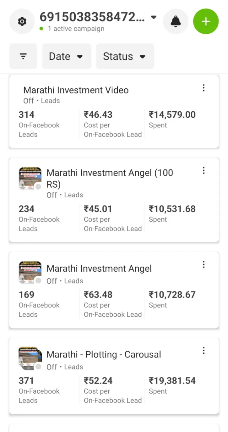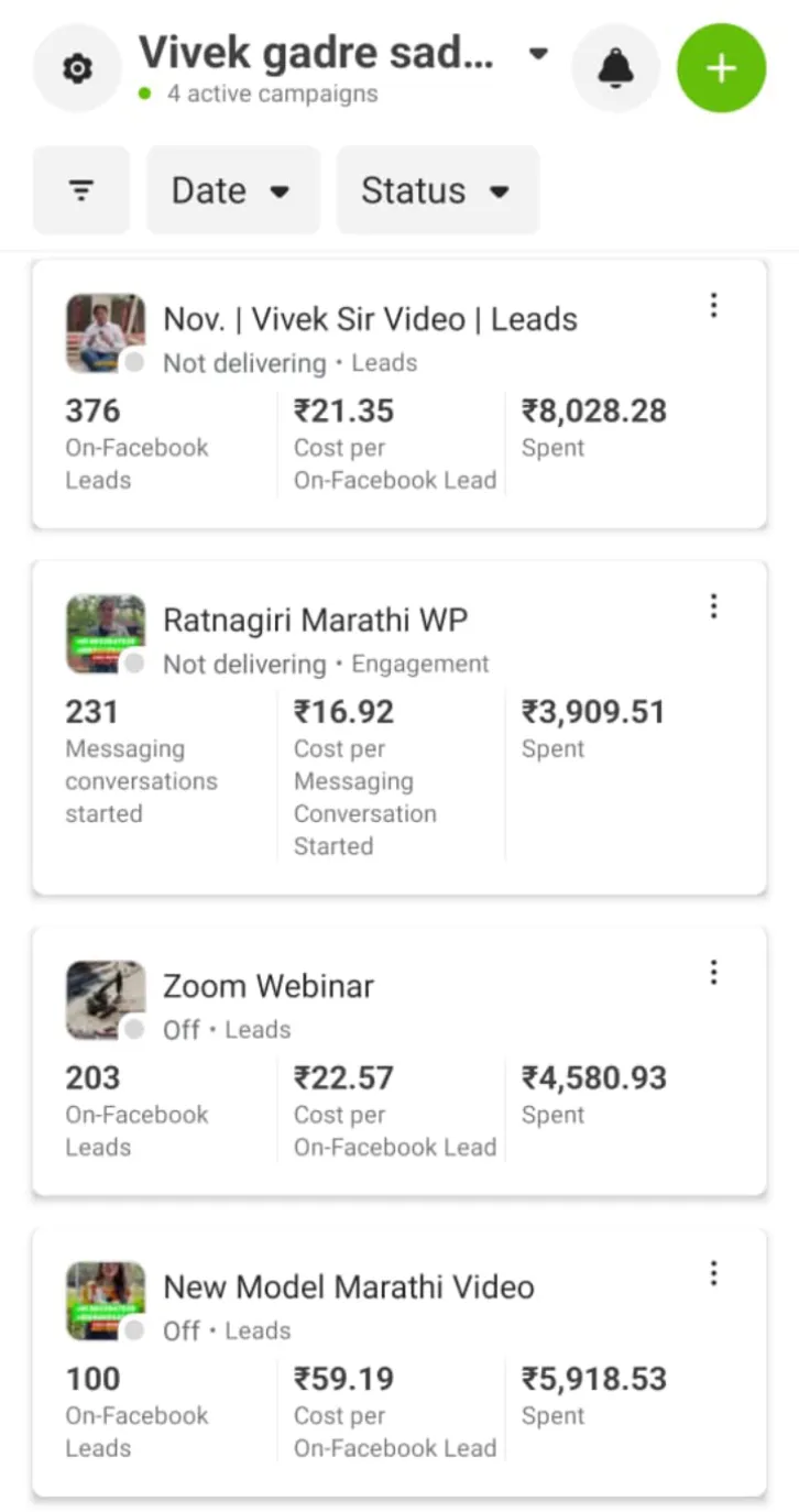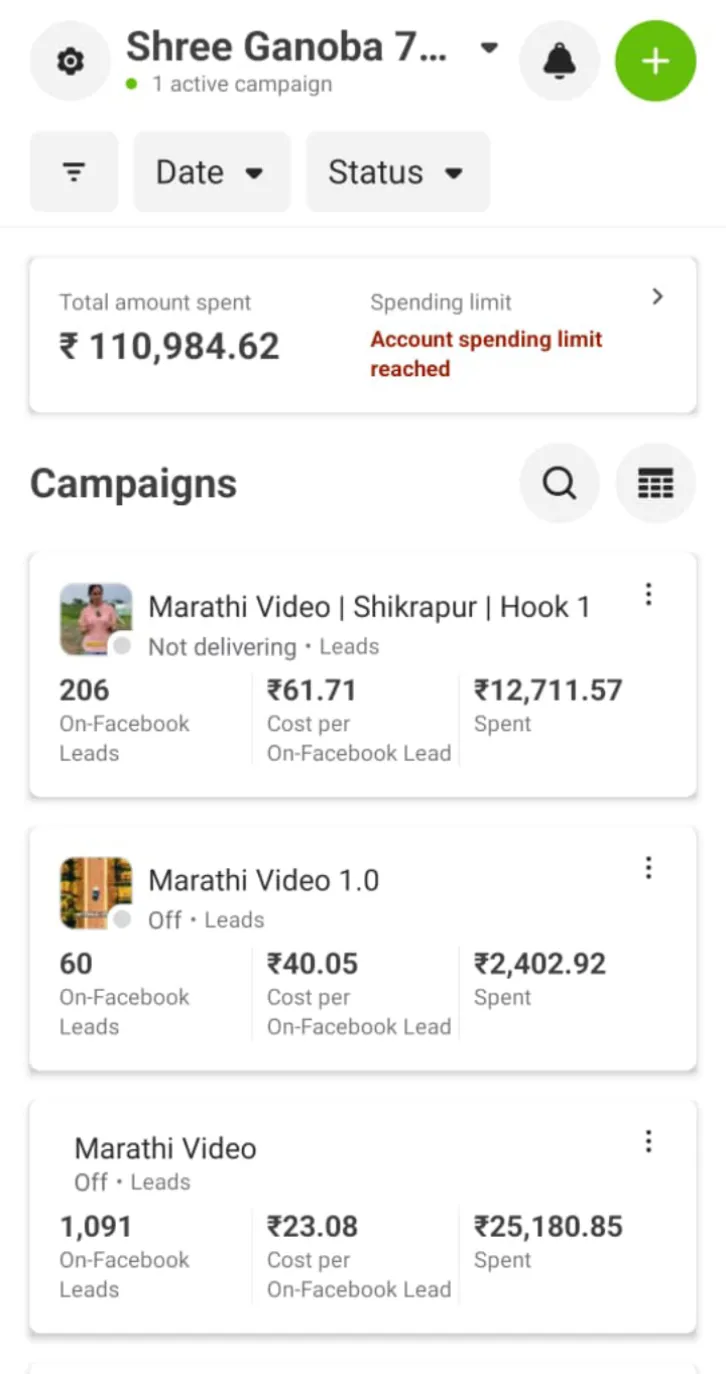 • Campaign 1: 1,091 leads at ₹23.08/lead.